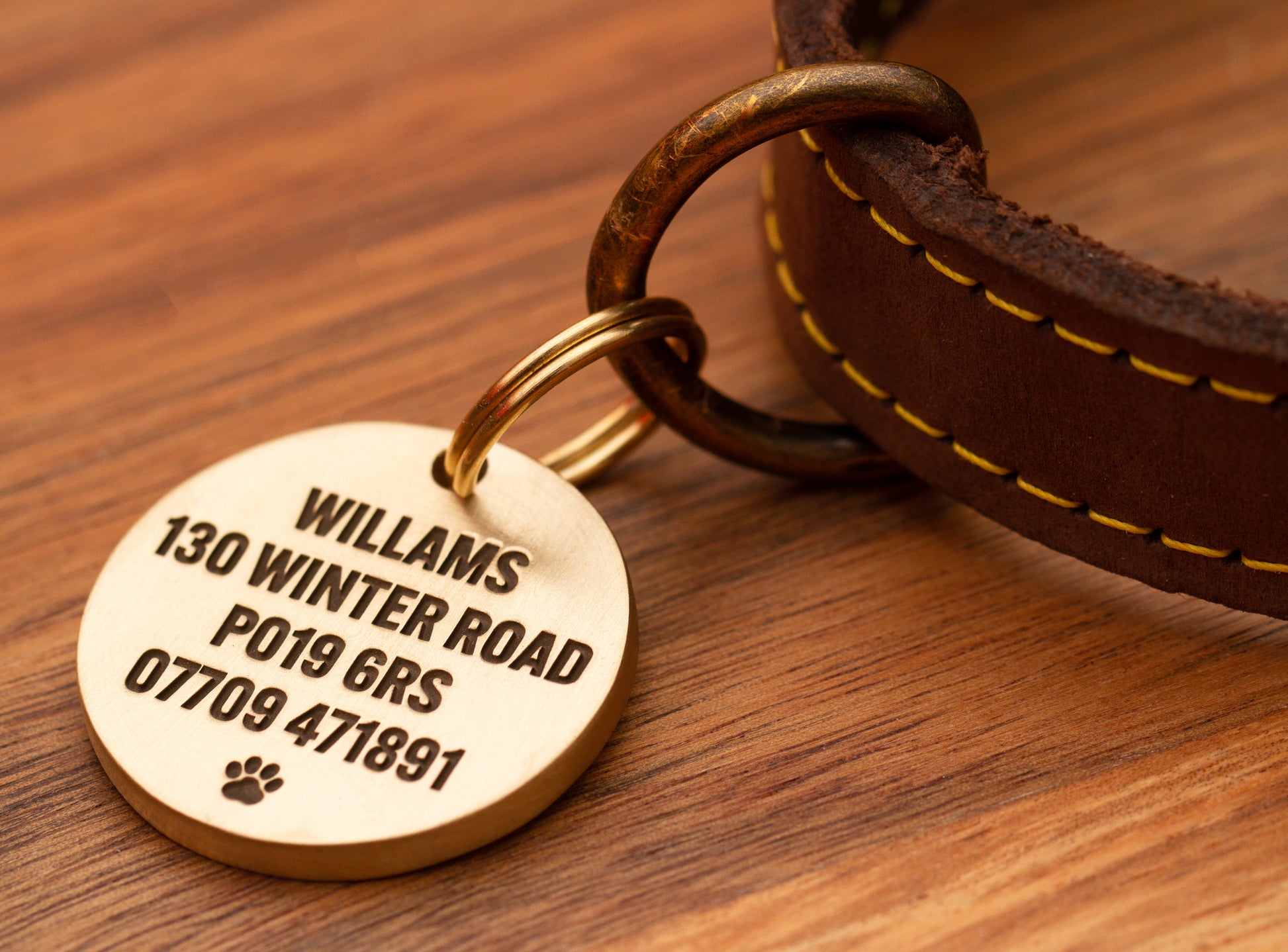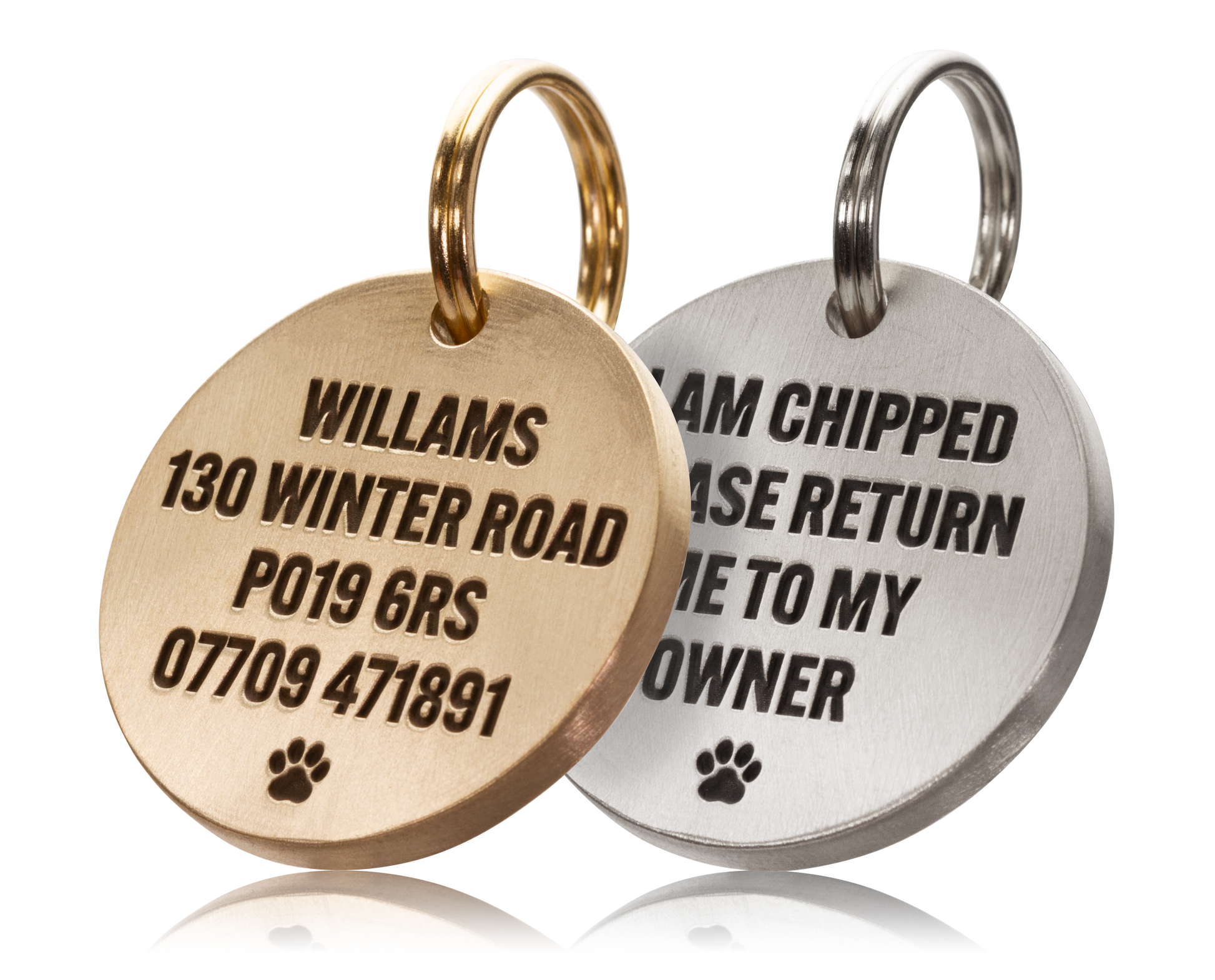- A high quality & deep engraved personalised round dog/pet I.D. tag